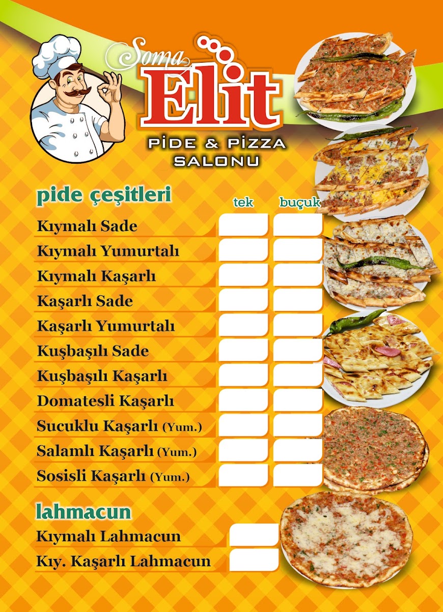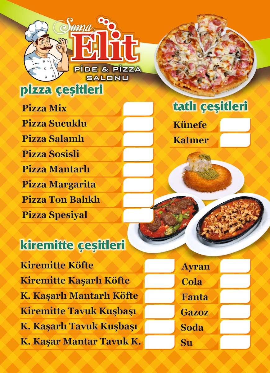 From a reviewer’s perspective, the menu at Soma Elit Pide Salonu impresses with its classic Turkish offerings presented in a straightforward, satisfying way. The pide çeşitleri section features options like kıymalı pide, kıymalı yumurtalı pide, kıymalı kaşarlı pide, kaşarlı yumurtalı pide, and kaşarlı sade pide, catering to both meat lovers and cheese enthusiasts. The lahmacun çeşitleri include the traditional lahmacun, the spicier acılı lahmacun, and the cheesy kaşarlı lahmacun, providing variety for those seeking a lighter, flavorful option. Pizza options range from pizza mix to pizza sucuklu, pizza vejeteryan, pizza sosisli, and pizza salamlı, bridging Turkish flavors with familiar Italian-style comfort. For dessert, the restaurant offers rich and indulgent choices such as künefe and katmer, perfect for finishing the meal on a sweet note. The drink selection is simple yet practical, featuring kutu kola, kutu fanta, kutu sprite, Eker ayran 300ml, and Eker ayran 1 litre, complementing the savory dishes without overwhelming the palate. Overall, the menu strikes a balance between traditional Turkish favorites and accessible comfort foods, all at approachable prices, making Soma Elit Pide Salonu a dependable choice for both casual meals and quick bites.